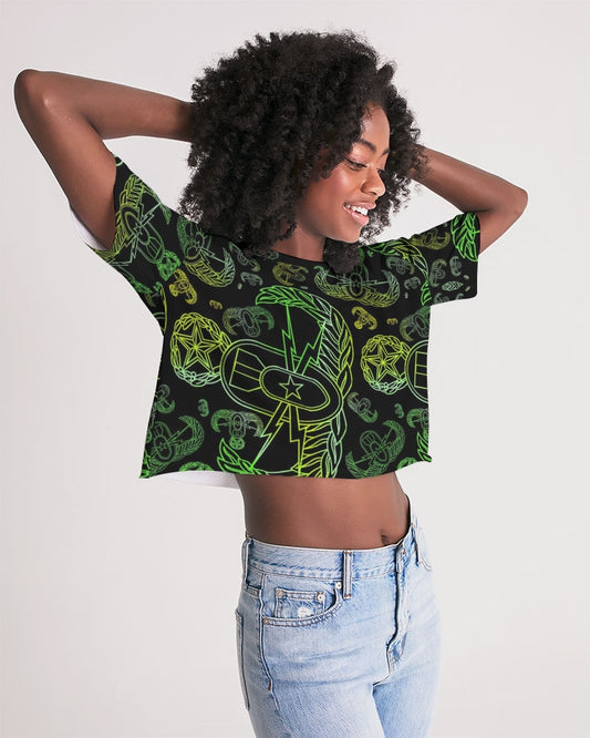 Print On Demand - French Terry Cropped Tee - "EOD Mixed Badges" (Lemon Lime on Black)