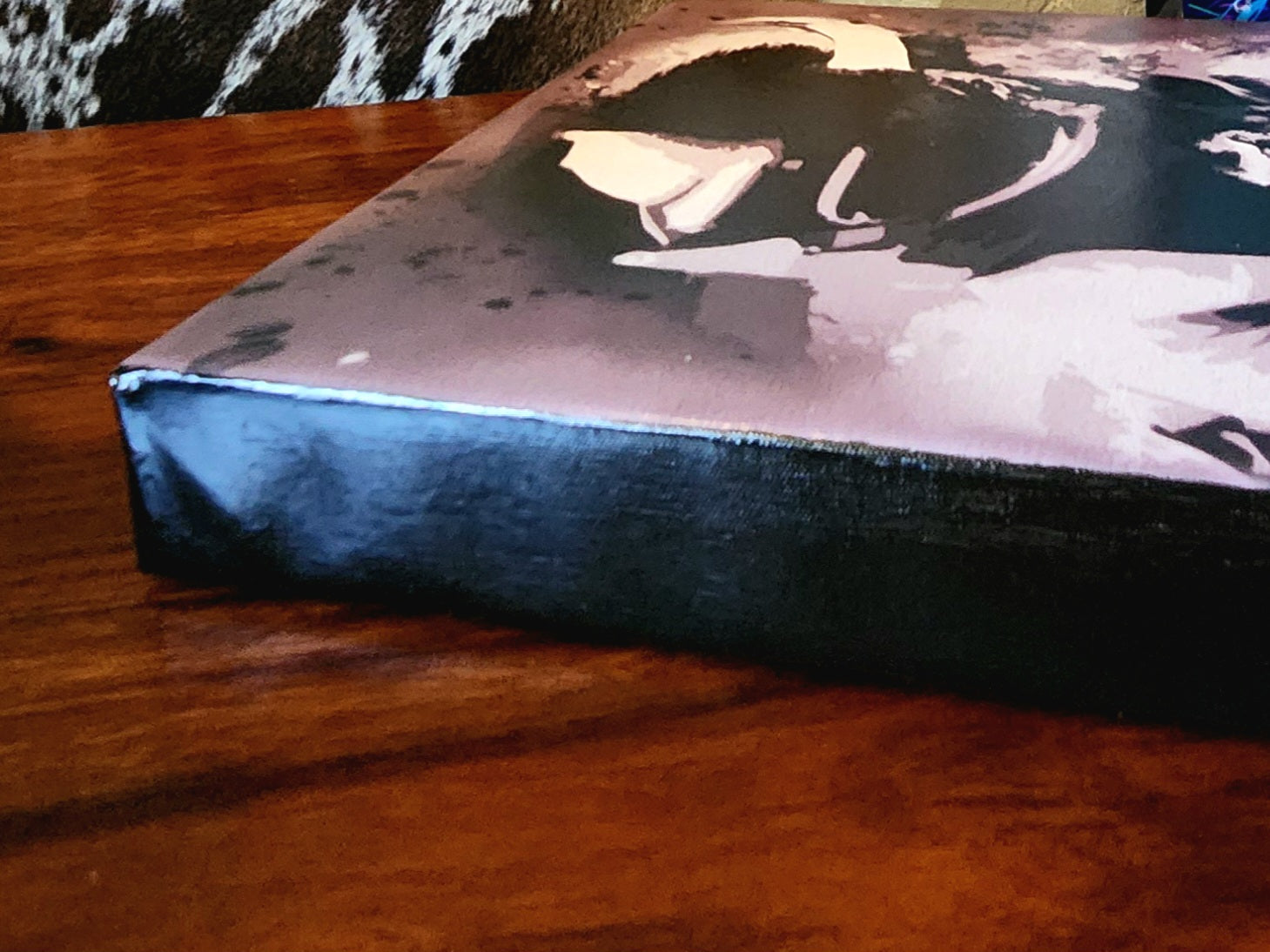 Sublimated onto white canvas, stretched over 8" x 10" x 1.5" wooden frame, painted black edges, with painted protective clear coat.