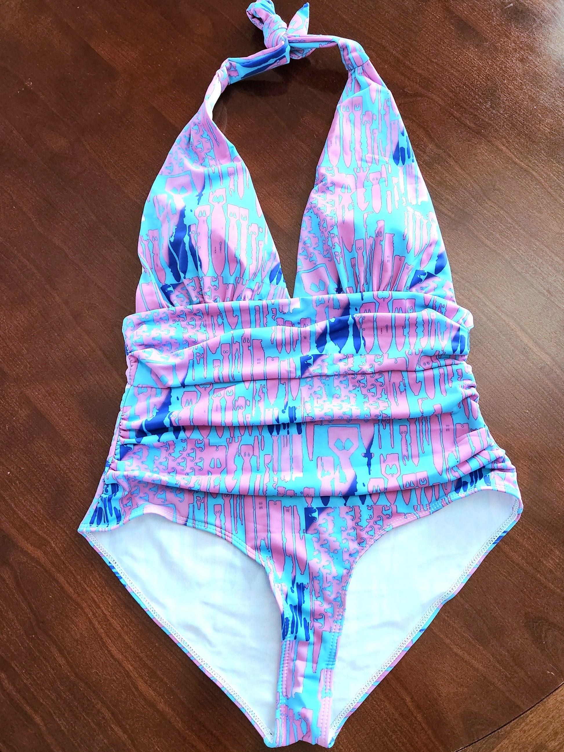 - Deep V-neck, removable padded cups, ruched front, tummy control, backless