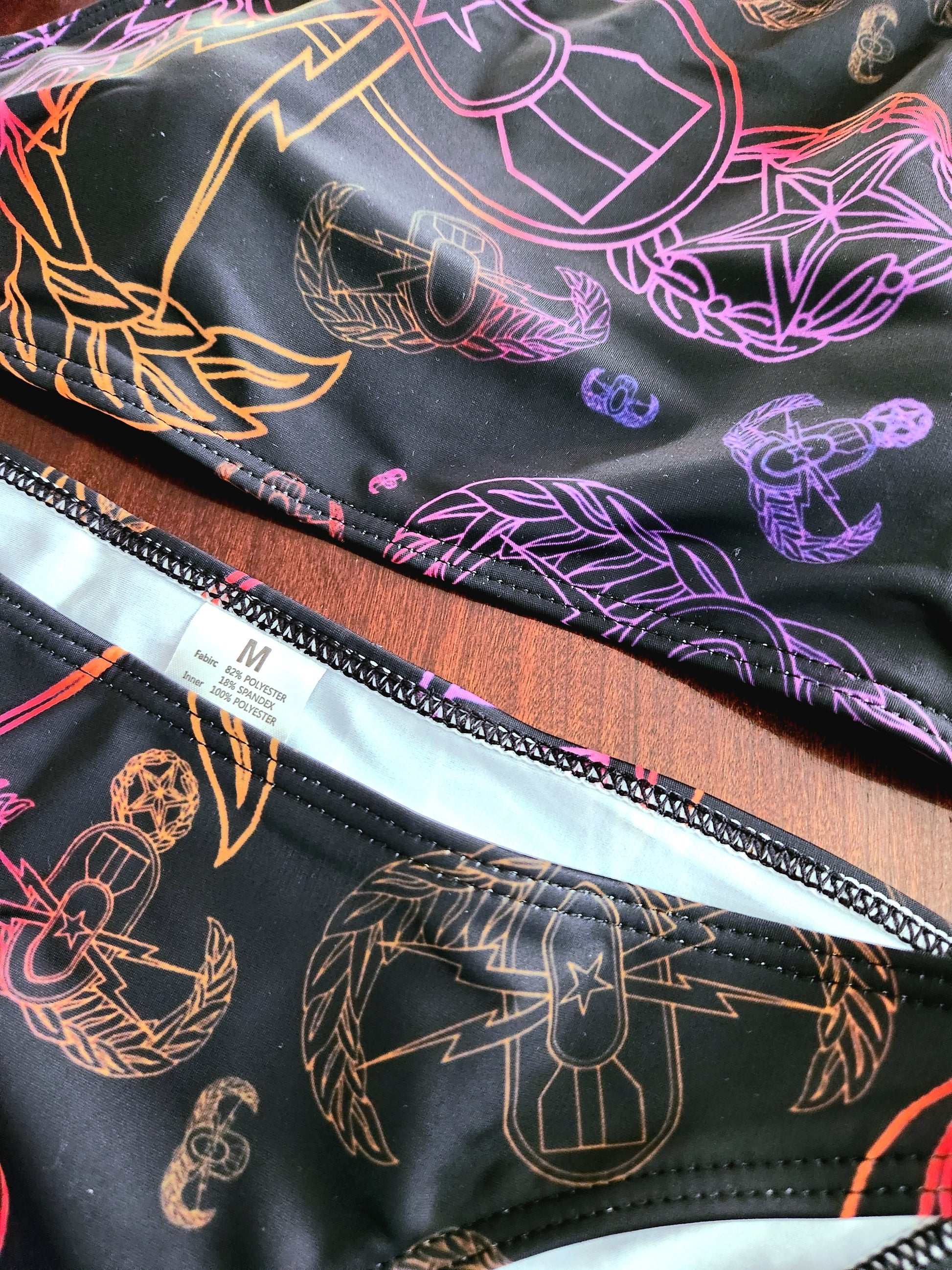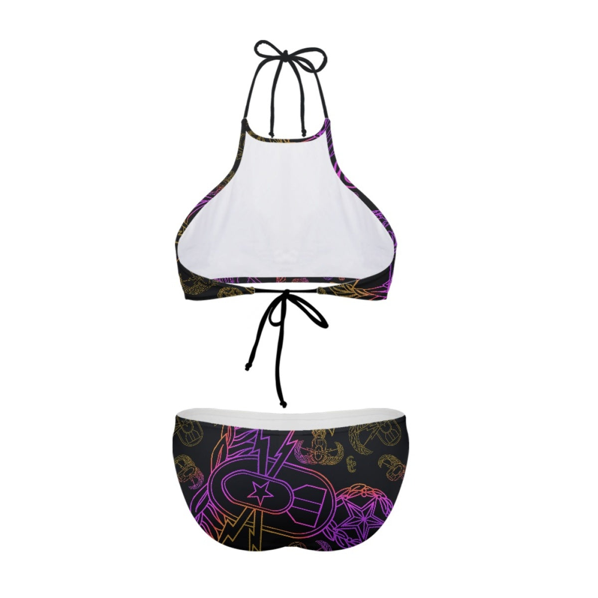 Women's High Neck Bikini - "EOD Mixed Badges" (Purple/Yellow on Black)