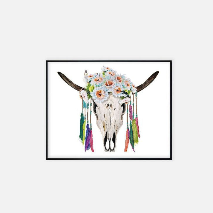 This unique print of a longhorn skull with Saguaro Blossoms and Hummingbirds contrasts the beauty of life and death in such a bohemian way
