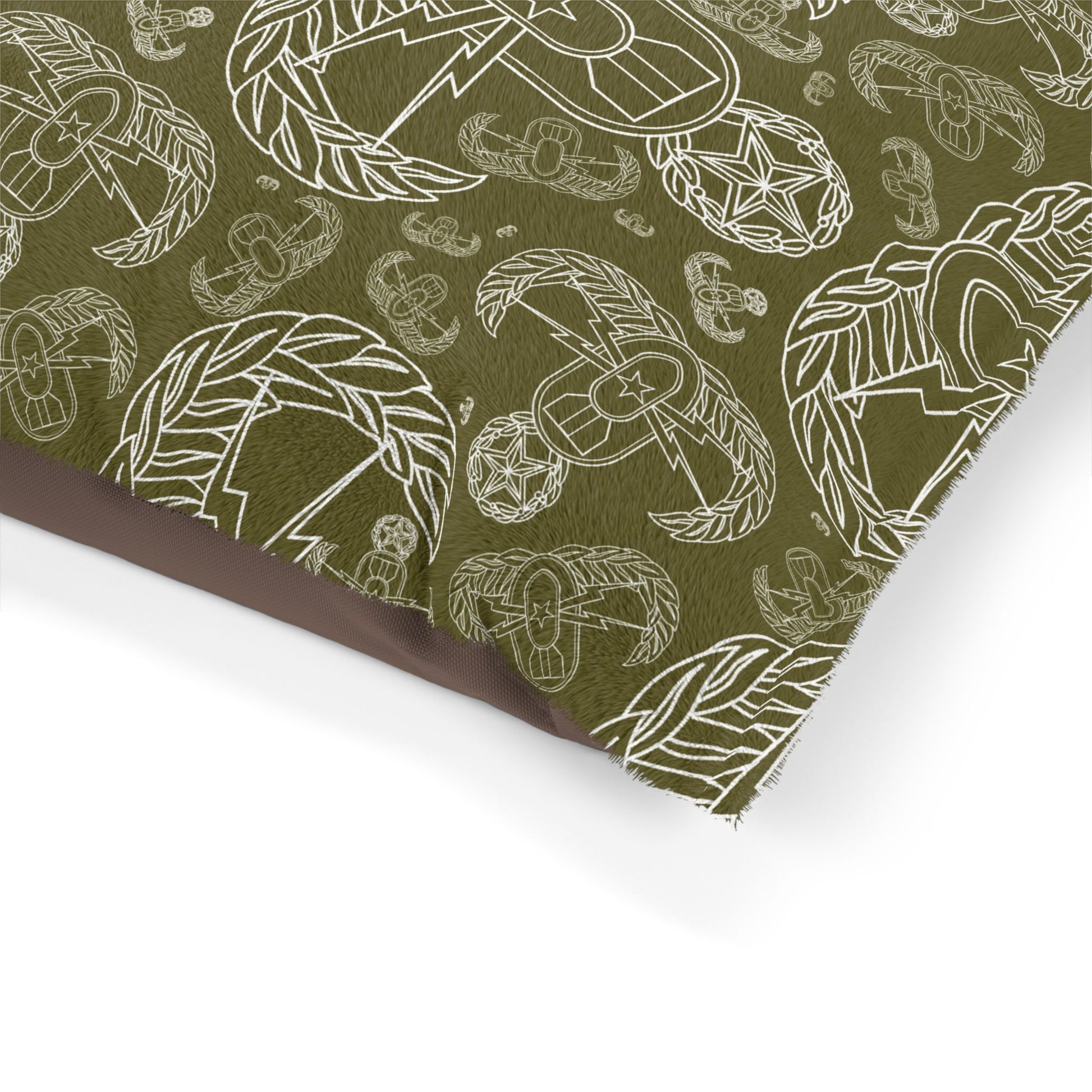 Pet Bed — "EOD Mixed Badges" (White on Olive)